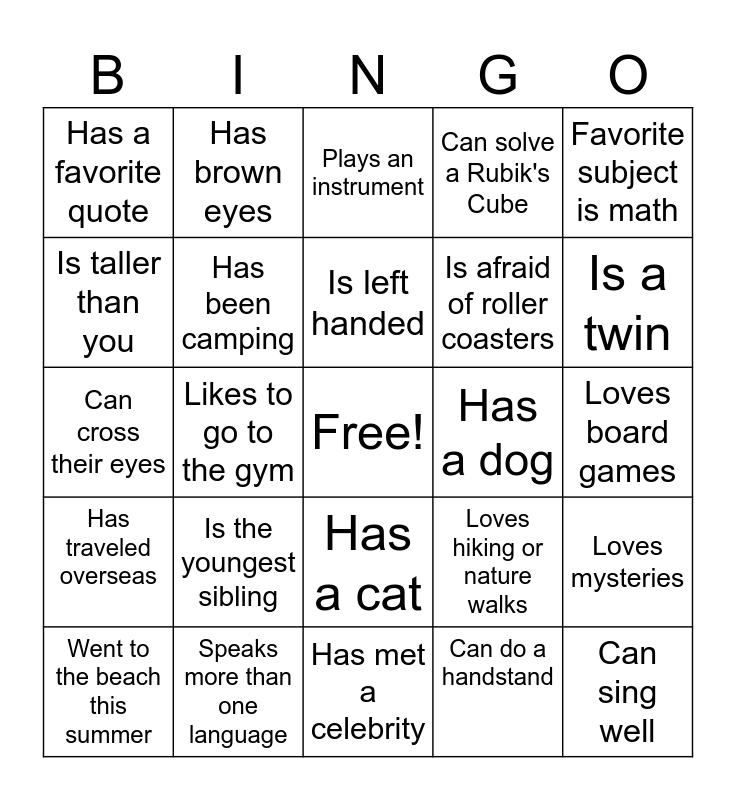 This bingo card has a free space and 34 words: Is the oldest sibling, Can do a handstand, Plays a sport, Has a pet bird, Has traveled overseas, Has been camping, Favorite subject is math, Went to the beach this summer, Has brown eyes, Broke a bone, Is left handed, Plays an instrument, Is allergic to something, Made the bed today, Has a dog, Is a twin, Speaks more than one language, Can cross their eyes, Is the youngest sibling, Loves hiking or nature walks, Has a cat, Loves to swim, Has a favorite quote, Loves board games, Has met a celebrity, Can sing well, Can solve a Rubik's Cube, Wears glasses, Is afraid of roller coasters, Is taller than you, Enjoys puzzles, Likes to go to the gym, Loves mysteries and Can juggle.