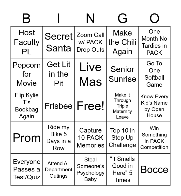 This bingo card has a free space and 24 words: Ride my Bike 5 Days in a Row, Attend All Department Outings, Live Mas, Everyone Passes a Test/Quiz, One Month No Tardies in PACK, Host Faculty PL, Popcorn for Movie, Secret Santa, Make it Through Triple Maternity Leave, Capture 10 PACK Memories, Senior Sunrise, Flip Kylie T's Bookbag Again, Top 10 in Step Up Challenge, Win Something in PACK Competition, Get Lit in the Pit, "It Smells Good in Here" 5 Times, Know Every Kid's Name by Open House, Zoom Call w/ PACK Drop Outs, Go To One Softball Game, Frisbee, Bocce, Prom, Make the Chili Again and Steal Someone's Psychology Baby.
