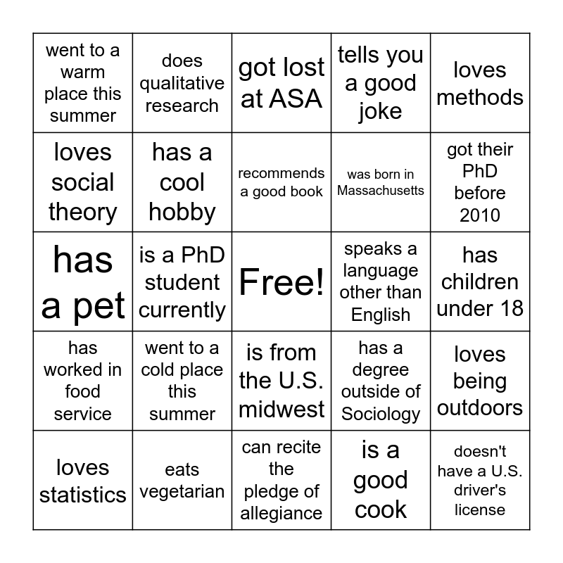 This bingo card has a free space and 24 words: went to a cold place this summer, eats vegetarian, recommends a good book, loves statistics, loves methods, went to a warm place this summer, loves social theory, does qualitative research, speaks a language other than English, is from the U.S. midwest, was born in Massachusetts, has a pet, has a degree outside of Sociology, loves being outdoors, has a cool hobby, is a good cook, has children under 18, got lost at ASA, got their PhD before 2010, is a PhD student currently, doesn't have a U.S. driver's license, has worked in food service, tells you a good joke and can recite the pledge of allegiance.