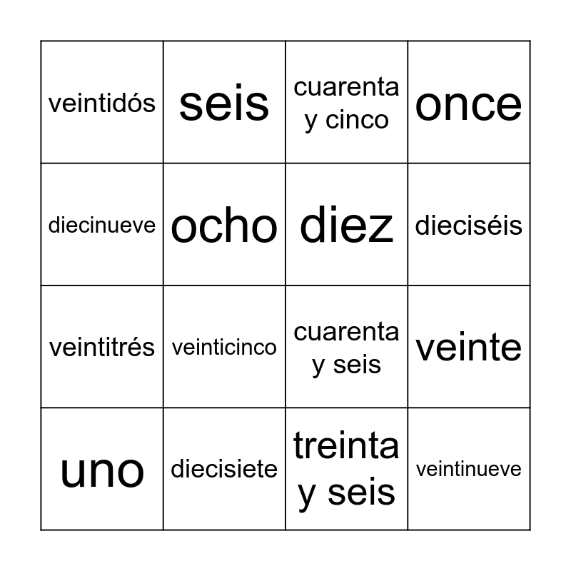 This bingo card has 47 words: Free!, uno, dos, tres, cuatro, cinco, seis, siete, ocho, nueve, diez, once, doce, trece, catorce, quince, dieciséis, diecisiete, dieciocho, diecinueve, veinte, veintiuno, veintidós, veintitrés, veinticuatro, veinticinco, veintiséis, veintisiete, veintiocho, veintinueve, treinta, treinta y uno, treinta y dos, treinta y tres, treinta y cuatro, treinta y cinco, treinta y seis, treinta y siete, treinta y ocho, treinta y nueve, cuarenta, cuarenta y cinco, cuarenta y seis, cuarenta y siete, cuarenta y ocho, cuarenta y nueve and cincuenta.