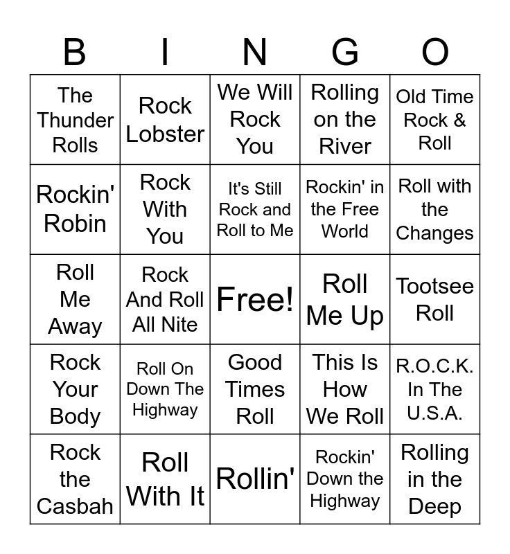 This bingo card has a free space and 33 words: Rock You Like A Hurricane, I Wanna Rock, Rock And Roll All Nite, For Those About to Rock (We Salute You), Rock Your Body, Rock With You, Old Time Rock & Roll, Rock the Casbah, Rock Lobster, Rock and a Hard Place, It's Still Rock and Roll to Me, We Will Rock You, I Love Rock 'N Roll, Roll On (Eighteen Wheeler), Roll Me Up, Roll with the Changes, Roll With It, Roll Me Away, Roll On Down The Highway, This Is How We Roll, Good Times Roll, Ready Set Roll, The Thunder Rolls, Tootsee Roll, Rollin', Rolling in the Deep, Rolling on the River, Rockin' in the Free World, Rockin' Robin, R.O.C.K. In The U.S.A., Rock'n Me, Rockin' Down the Highway and Rockin' Into The Night.