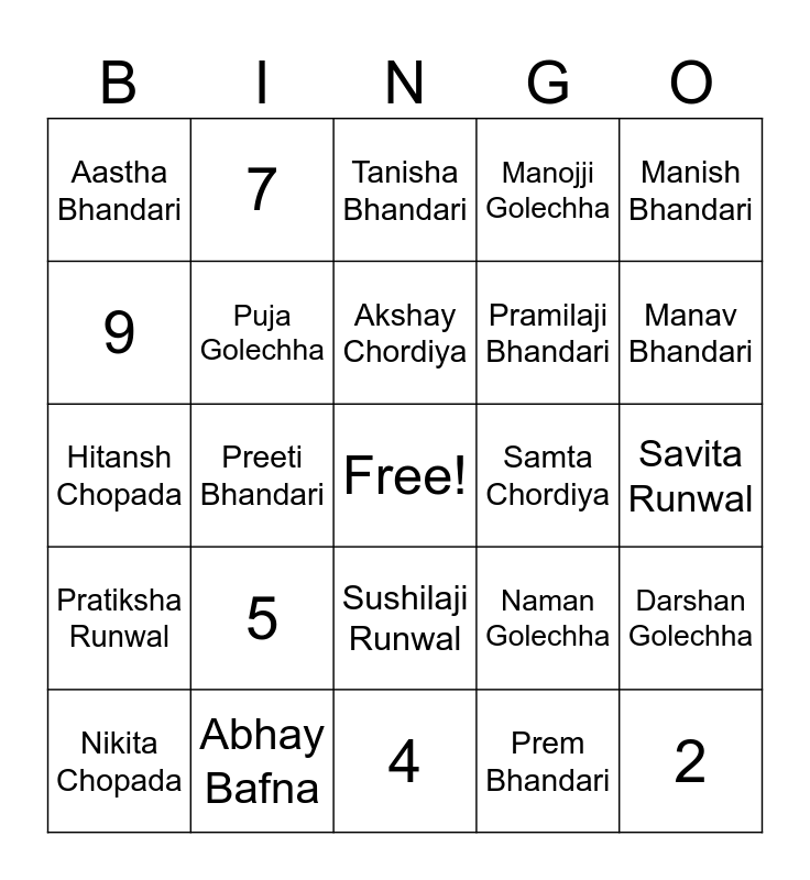 This bingo card has a free space and 50 words: 1, 2, 3, 4, 5, 6, 7, 8, 9, 10, Puja Golechha, Manojji Golechha, Darshan Golechha, Naman Golechha, Rajendraji Chordiya, Deepali Chordiya, Akshay Chordiya, Samta Chordiya, Darpan Chordiya, Manish Bhandari, Preeti Bhandari, Prem Bhandari, Aastha Bhandari, Pramilaji Bhandari, Rahul Bhandari, Sadhana Bhandari, Manav Bhandari, Kajal Bagmar, Tanisha Bhandari, Sushilaji Runwal, Sandesh Runwal, Rupa Runwal, Isha Runwal, Dhriti Runwal, Abhay Bafna, Rekha Bafna, Mayur Bafna, Chaitali Bafna, Rajesh Runwal, Savita Runwal, Dhawal Runwal, Saniya Runwal, Rajniji Chopada, Tushar Chopada, Nikita Chopada, Hitansh Chopada, Ansh Chopada, Pritesh Runwal, Pratiksha Runwal and Yukti Runwal.