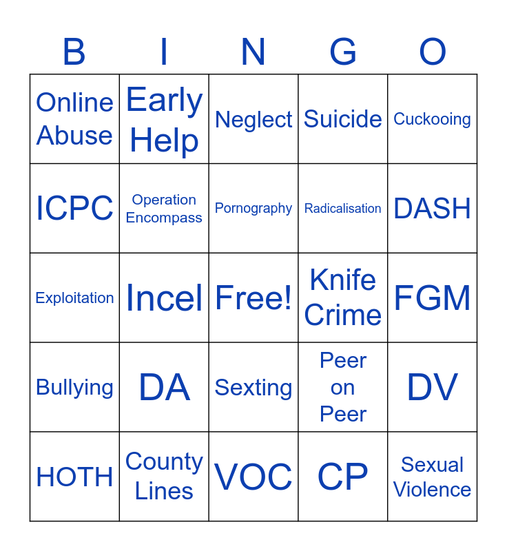 This bingo card has a free space and 24 words: DA, County Lines, Pornography, HOTH, Cuckooing, Online Abuse, ICPC, Early Help, Knife Crime, Sexting, Radicalisation, Exploitation, Peer on Peer, DV, Operation Encompass, CP, FGM, Neglect, DASH, Incel, Sexual Violence, Bullying, Suicide and VOC.