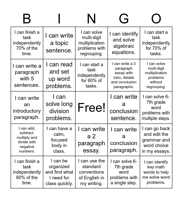 This bingo card has a free space and 24 words: I can have a calm, focused body in class., I can be organized and find what I need for class quickly., I can start a task independently for 60% of tasks., I can finish a task independently 60% of the time., I can start a task independently for 70% of tasks., I can finish a task independently 70% of the time., I can write a paragraph with 5 sentences., I can write a topic sentence., I can write a conclusion sentence., I can write a 2 paragraph essay., I can write a 3 paragraph essay with intro, details and conclusion paragraphs., I can write an introductory paragraph., I can write a conclusion paragraph., I can go back and edit the grammar and word choice in my essays., I can read and set up word problems., I can solve 6-7th grade word problems with a single step., I can solve 6-7th grade word problems with multiple steps., I can solve multi-digit multiplication problems with regrouping., I can solve multi-digit multiplication problems without regrouping., I can solve long division problems., I can identify key math words to help me solve word problems., I can add, subtract, multiply and divide with negative numbers., I can identify and solve algebraic equations. and I can use the standard conventions of English in my writing..