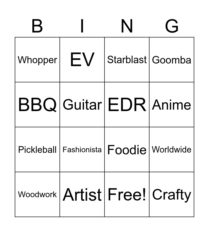 This bingo card has 17 words: Free!, Woodwork, Starblast, Whopper, Fashionista, Goomba, Worldwide, EDR, Anime, Guitar, Artist, Foodie, BBQ, EV, Pickleball, Whiskey and Crafty.