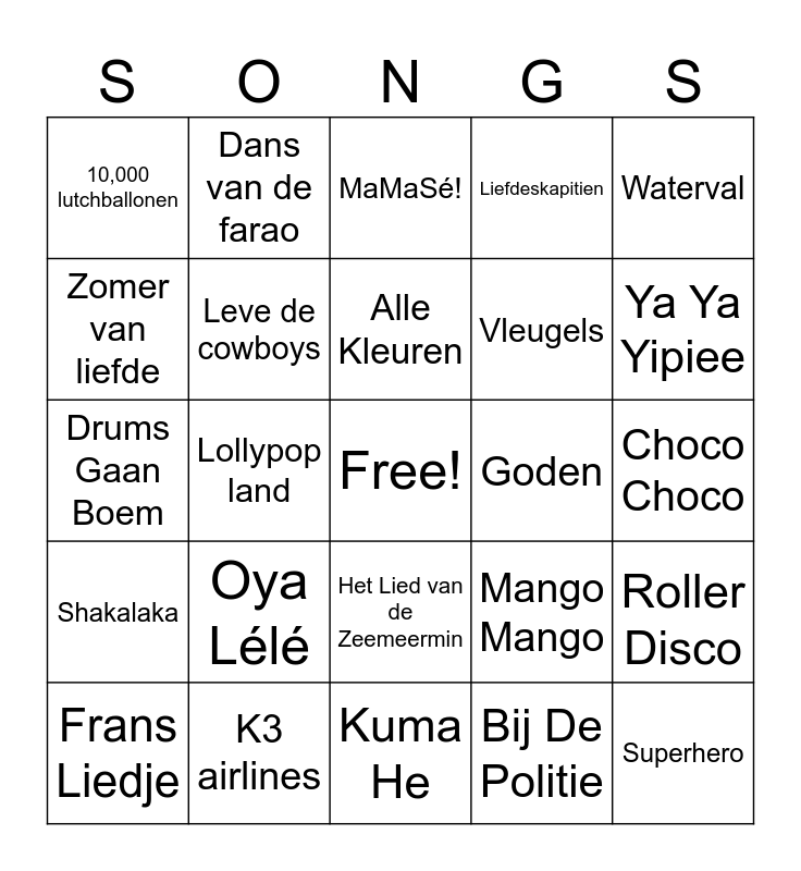 This bingo card has a free space and 25 words: Oya Lélé, Kuma He, Alle Kleuren, Frans Liedje, Waterval, 10,000 lutchballonen, Zomer van liefde, Dans van de farao, Goden, Het Lied van de Zeemeermin, Vleugels, Drums Gaan Boem, Mango Mango, Roller Disco, Leve de cowboys, Feest, Choco Choco, MaMaSé!, Ya Ya Yipiee, Lollypop land, Superhero, K3 airlines, Shakalaka, Liefdeskapitien and Bij De Politie.
