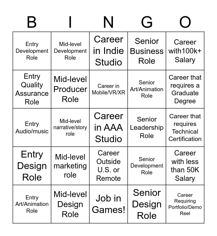 This bingo card has 25 words: Entry Design Role, Mid-level Design Role, Career in AAA Studio, Senior Design Role, Career with100k+ Salary, Entry Development Role, Mid-level Development Role, Career in Indie Studio, Senior Leadership Role, Career with less than 50K Salary, Entry Quality Assurance Role, Mid-level Producer Role, Job in Games!, Senior Development Role, Career that requires a Graduate Degree, Entry Art/Animation Role, Mid-level narrative/story role, Career in Mobile/VR/XR, Senior Art/Animation Role, Career that requires Technical Certification, Entry Audio/music, Mid-level marketing role, Career Outside U.S. or Remote, Senior Business Role and Career Requiring Portfolio/Demo Reel.