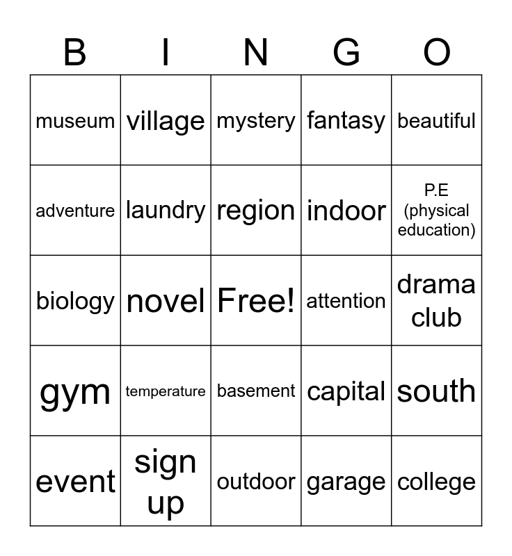 This bingo card has a free space and 63 words: center, city, east, north, south, town, village, west, attention, strange, event, secret, capital, beautiful, peaceful, novel, mystery, fantasy, author, adventure, sign up, outdoor, indoor, drama club, arts and crafts, activity, act, physics, P.E (physical education), music, literature, I.T (information technology), history, geography, biology, transportation, possession, restaurant, college, museum, temperature, region, delta, apartment, gym, yard, pool, garage, balcony, dish, kitchen, basement, bed, clean, dinner, laundry, shopping, living room, sick, excuse me, home, market and mall.