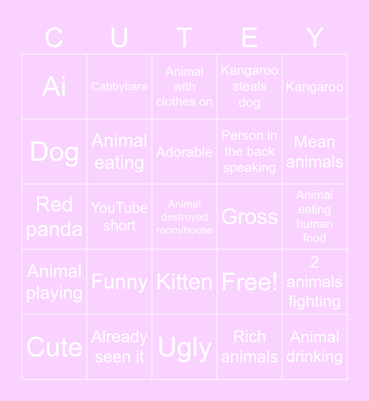 This bingo card has 25 words: Funny, Ugly, Adorable, Cute, Kangaroo, Ai, Dog, Cabbybara, Gross, Kitten, Person in the back speaking, Red panda, Free!, 2 animals fighting, Animal eating, Animal drinking, Animal eating human food, Animal with clothes on, Mean animals, YouTube short, Animal destroyed room/house, Already seen it, Animal playing, Kangaroo steals dog and Rich animals.