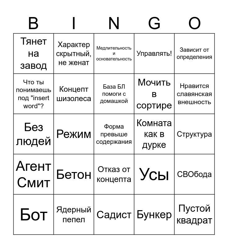 This bingo card has a free space and 24 words: Бетон, Ядерный пепел, База БЛ помоги с домашкой, Бот, Зависит от определения, Тянет на завод, Что ты понимаешь под "insert word"?, Характер скрытный, не женат, Комната как в дурке, Отказ от концепта, Мочить в сортире, Без людей, Усы, СВОбода, Концепт шизолеса, Бункер, Структура, Медлительность и основательность, Нравится славянская внешность, Режим, Пустой квадрат, Агент Смит, Управлять! and Садист.