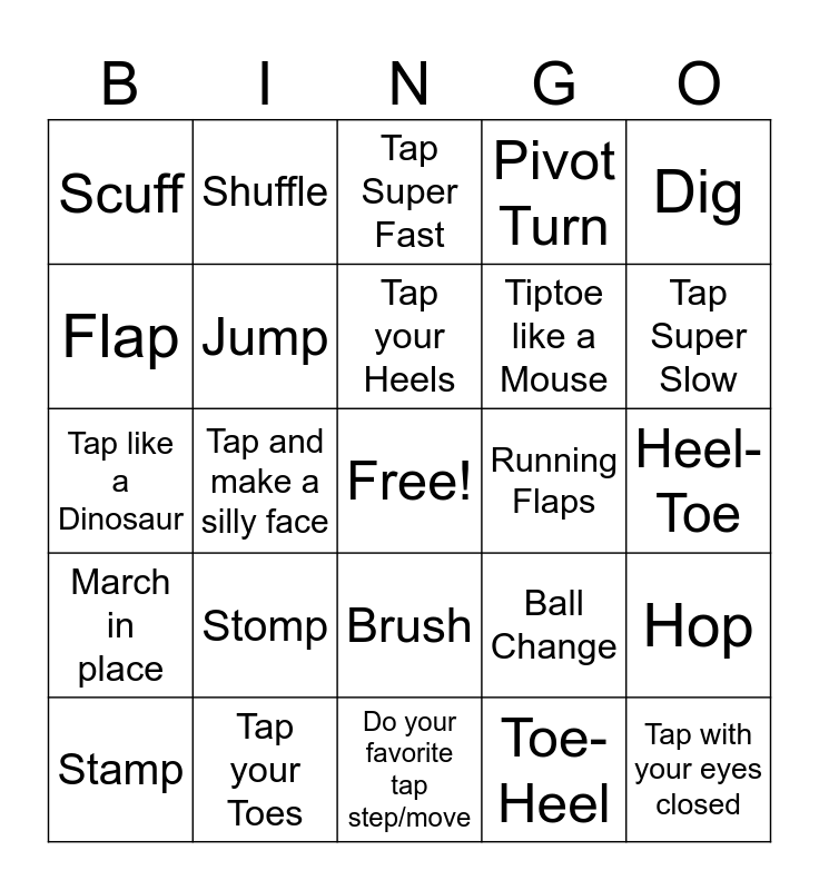 This bingo card has a free space and 24 words: Stomp, Tap your Toes, Tap your Heels, Stamp, Dig, Scuff, Flap, Shuffle, Running Flaps, Brush, Tiptoe like a Mouse, Tap like a Dinosaur, Ball Change, Hop, Jump, Toe-Heel, Heel-Toe, Tap Super Fast, Tap Super Slow, Tap and make a silly face, Tap with your eyes closed, March in place, Pivot Turn and Do your favorite tap step/move.