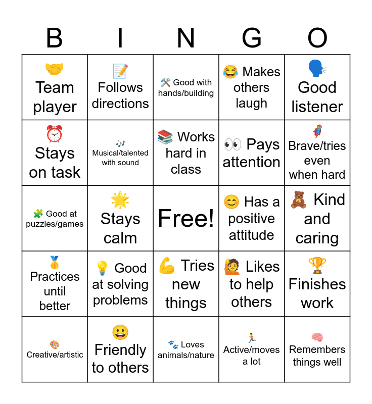 This bingo card has a free space and 24 words: 💡 Good at solving problems, 😀 Friendly to others, 📚 Works hard in class, 🎨 Creative/artistic, 🗣️ Good listener, 🤝 Team player, ⏰ Stays on task, 📝 Follows directions, 😊 Has a positive attitude, 💪 Tries new things, 👀 Pays attention, 🧩 Good at puzzles/games, 🙋 Likes to help others, 🏆 Finishes work, 🎶 Musical/talented with sound, 🏃 Active/moves a lot, 🧸 Kind and caring, 🛠️ Good with hands/building, 🦸 Brave/tries even when hard, 🌟 Stays calm, 🧠 Remembers things well, 🥇 Practices until better, 😂 Makes others laugh and 🐾 Loves animals/nature.