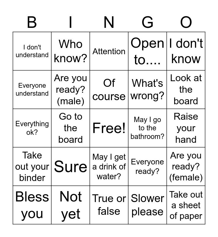 This bingo card has a free space and 24 words: Sure, Not yet, Of course, Bless you, I don't know, I don't understand, Everyone understand, Who know?, May I go to the bathroom?, May I get a drink of water?, What's wrong?, Everything ok?, Everyone ready?, Are you ready? (female), Are you ready? (male), Slower please, Raise your hand, Attention, Look at the board, Go to the board, Take out a sheet of paper, Take out your binder, Open to.... and True or false.