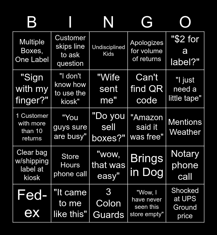 This bingo card has 31 words: 3 Colon Guards, $100+ Transaction, "You guys sure are busy", Believes Amazon RMA code is all they need, Multiple Boxes, One Label, Undisciplined Kids, "I don't know how to use the kiosk", Brings in Dog, "Amazon said it was free", "Wow, I have never seen this store empty", Mentions Weather, "Do you sell boxes?", Shocked at UPS Ground price, "They said I didn't need a box", "I just need a little tape", Mistakes us for USPS, Notary phone call, Store Hours phone call, Clear bag w/shipping label at kiosk, "wow, that was easy", "$2 for a label?", "I normally go to kohls/staples", Fed-ex, Customer skips line to ask question, Can't find QR code, "Sign with my finger?", Apologizes for volume of returns, 1 Customer with more than 10 returns, "It came to me like this", "Wife sent me" and Allergic to scale.
