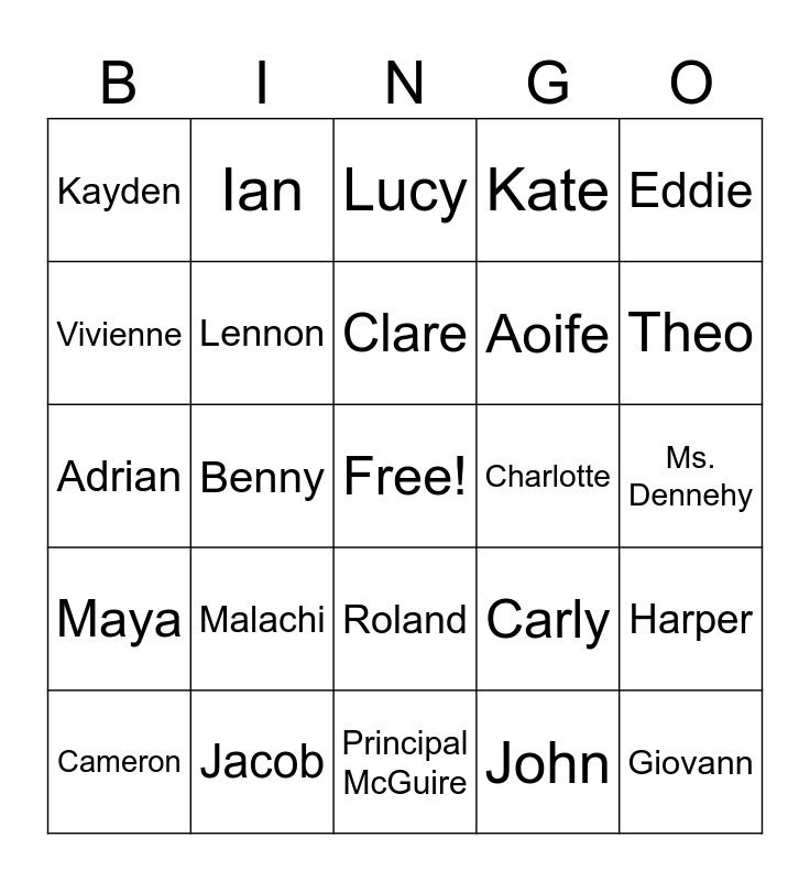 This bingo card has a free space and 24 words: Malachi, Jacob, Clare, Cameron, Eddie, Kayden, Vivienne, Ian, Charlotte, Roland, Aoife, Adrian, Carly, Harper, Lennon, John, Ms. Dennehy, Lucy, Theo, Benny, Giovann, Maya, Kate and Principal McGuire.