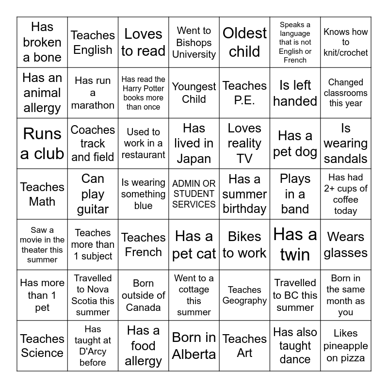 This bingo card has a free space and 48 words: Teaches Geography, Is left handed, Born in Alberta, Can play guitar, Used to work in a restaurant, Has had 2+ cups of coffee today, Teaches English, Has taught at D'Arcy before, Speaks a language that is not English or French, Has a pet cat, Knows how to knit/crochet, Went to Bishops University, Has a pet dog, Loves reality TV, Has more than 1 pet, Plays in a band, Has an animal allergy, Changed classrooms this year, Travelled to BC this summer, Oldest child, Teaches P.E., Is wearing something blue, Has broken a bone, Has run a marathon, Born in the same month as you, Has read the Harry Potter books more than once, Is wearing sandals, Teaches Science, Has lived in Japan, Coaches track and field, Has also taught dance, Has a summer birthday, Wears glasses, Travelled to Nova Scotia this summer, Teaches Math, Bikes to work, Has a twin, Runs a club, Teaches French, Born outside of Canada, Saw a movie in the theater this summer, Likes pineapple on pizza, Loves to read, Has a food allergy, Youngest Child, Went to a cottage this summer, Teaches more than 1 subject and Teaches Art.
