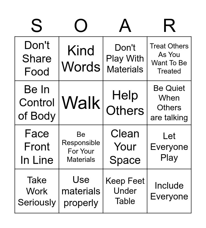 This bingo card has 28 words: Stay Quiet, Turn in Assignments on time, Face Front In Line, Encouraging Words, Walk, Don't Play With Materials, Kind Words, Include Everyone, Use materials properly, Do Your Own Work, Clean Your Space, Treat Others As You Want To Be Treated, Hands and Feet To Self, Listening Ears, Be Responsible For Your Materials, Support Others, Push In Your Chair, Help Others, Be Quiet When Others are talking, Help People, Don't Share Food, Don't Goof Off, Take Work Seriously, Let Everyone Play, Keep Feet Under Table, Try Your Best, Be In Control of Body and Share.