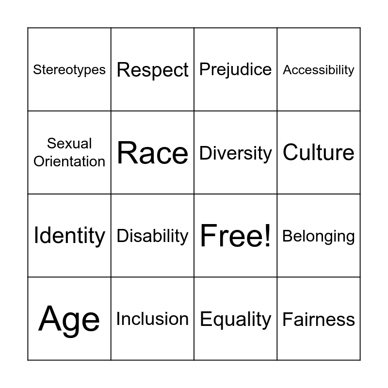This bingo card has 21 words: Inclusion, Discrimination, Respect, Protected Characteristics, Equality, Diversity, Stereotypes, Prejudice, Free!, Culture, Identity, Accessibility, Fairness, Gender, Race, Religion, Age, Disability, Sexual Orientation, Belonging and Human Rights.