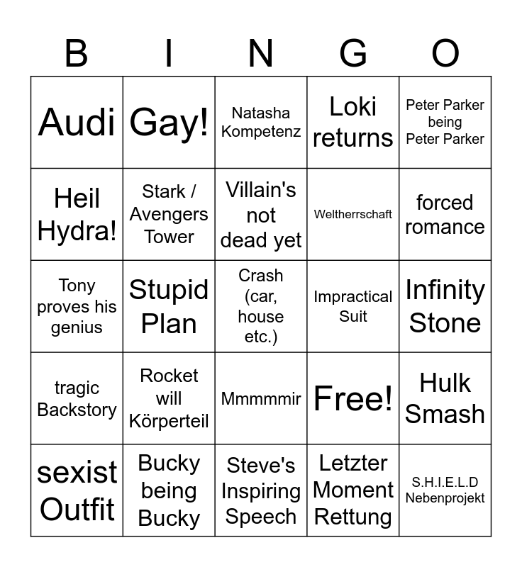 This bingo card has 25 words: Rocket will Körperteil, Steve's Inspiring Speech, Villain's not dead yet, sexist Outfit, Peter Parker being Peter Parker, Audi, Heil Hydra!, Gay!, Impractical Suit, Mmmmmir, Weltherrschaft, Tony proves his genius, Free!, Hulk Smash, Stark / Avengers Tower, S.H.I.E.L.D Nebenprojekt, Infinity Stone, Natasha Kompetenz, forced romance, Stupid Plan, Crash (car, house etc.), Bucky being Bucky, tragic Backstory, Loki returns and Letzter Moment Rettung.