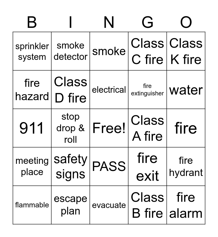 This bingo card has a free space and 24 words: safety signs, escape plan, electrical, flammable, Class K fire, sprinkler system, fire hazard, smoke detector, Class A fire, PASS, fire extinguisher, 911, fire exit, fire hydrant, Class D fire, Class B fire, fire, smoke, water, stop drop & roll, fire alarm, meeting place, Class C fire and evacuate.