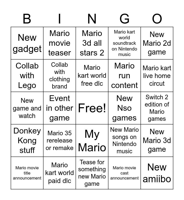 This bingo card has a free space and 24 words: Mario 35 rerelease or remake, Mario kart world paid dlc, Mario kart world free dlc, Mario movie title announcement, New Mario 2d game, New gadget, Collab with Lego, Mario movie teaser, New Nso games, My Mario, Mario run content, New game and watch, New Mario songs on Nintendo music, New Mario 3d game, Collab with clothing brand, Mario movie cast announcement, Switch 2 edition of Mario games, Mario 3d all stars 2, Mario kart live home circut, Event in other game, New amiibo, Donkey Kong stuff, Mario kart world soundtrack on Nintendo music and Tease for something new Mario game.