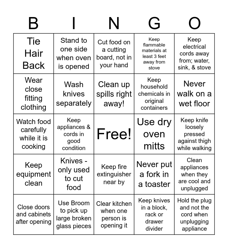 This bingo card has a free space and 24 words: Knives - only used to cut food, Use Broom to pick up large broken glass pieces, Clean up spills right away!, Close doors and cabinets after opening, Keep electrical cords away from; water, sink, & stove, Tie Hair Back, Wear close fitting clothing, Stand to one side when oven is opened, Use dry oven mitts, Keep fire extinguisher near by, Keep household chemicals in original containers, Watch food carefully while it is cooking, Never put a fork in a toaster, Clean appliances when they are cool and unplugged, Wash knives separately, Keep knives in a block, rack or drawer divider, Keep knife loosely pressed against thigh while walking, Cut food on a cutting board, not in your hand, Never walk on a wet floor, Keep appliances & cords in good condition, Hold the plug and not the cord when unplugging appliance, Keep equipment clean, Keep flammable materials at least 3 feet away from stove and Clear kitchen when one person is opening it.