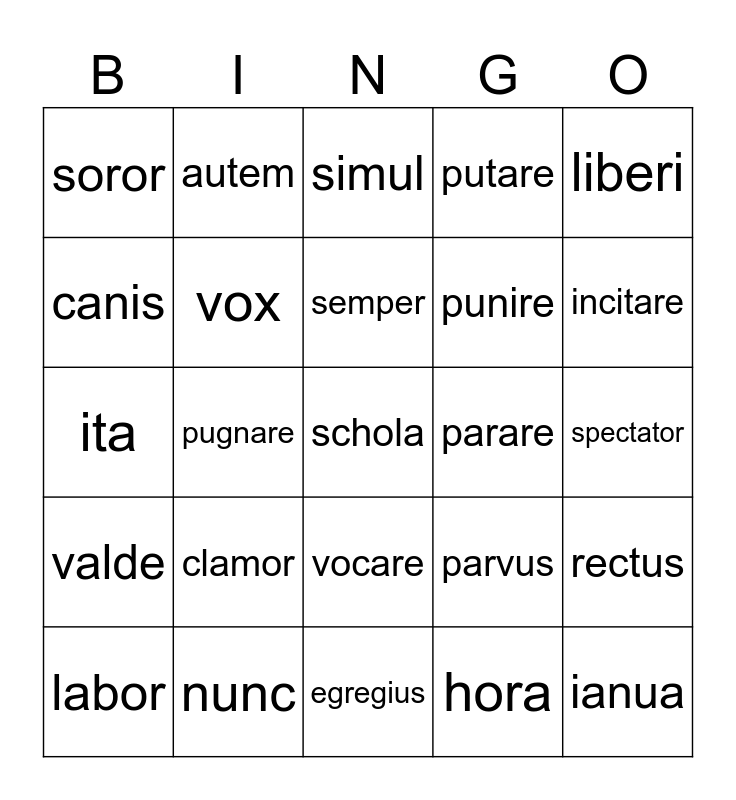 This bingo card has a free space and 24 words: clamor, nunc, semper, labor, liberi, soror, canis, autem, parare, vocare, punire, ita, parvus, rectus, vox, hora, spectator, simul, incitare, pugnare, ianua, valde, putare and egregius.