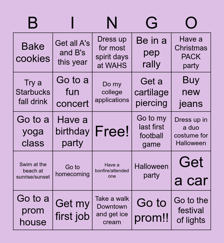 This bingo card has a free space and 24 words: Go to homecoming, Get my first job, Do my college applications, Go to a prom house, Have a Christmas PACK party, Bake cookies, Try a Starbucks fall drink, Get all A's and B's this year, Go to my last first football game, Have a bonfire/attended one, Get a cartilage piercing, Go to a yoga class, Halloween party, Get a car, Go to a fun concert, Go to prom!!, Dress up in a duo costume for Halloween, Dress up for most spirit days at WAHS, Buy new jeans, Have a birthday party, Go to the festival of lights, Swim at the beach at sunrise/sunset, Be in a pep rally and Take a walk Downtown and get ice cream.