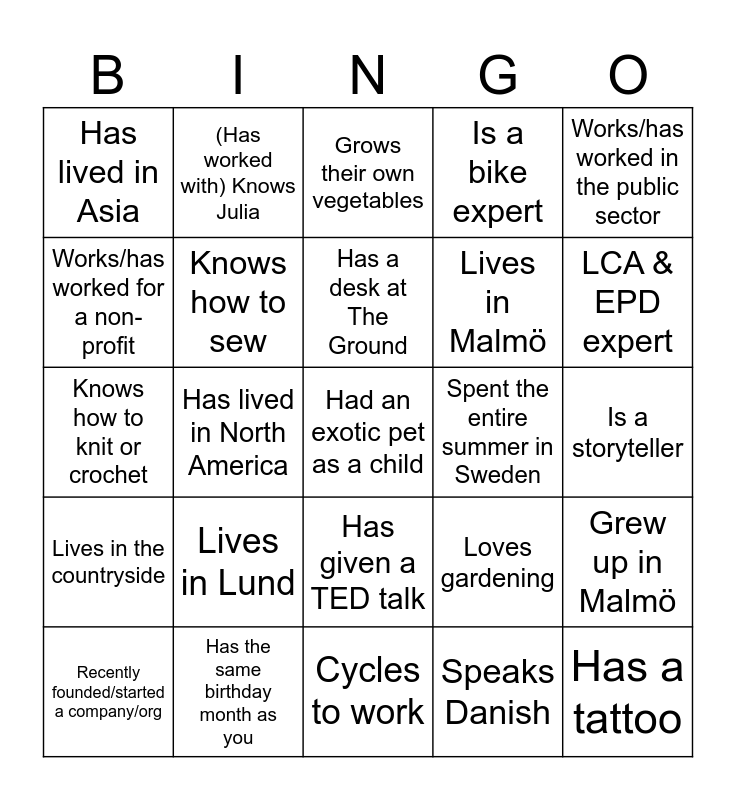 This bingo card has 63 words: Free!, Has hiked the Camino de Santiago, Was a semi-pro ice skater, Grew up in Malmö, Can see their office from their apartment window, Has worked with/knows Rowan, (Has worked with) Knows Julia, Has a child who has done “studenten”, Has a desk at The Ground, Has worked for the Swedish government, Has given a TED talk, Has worked for Malmö Stad, Is a storyteller, Works/has worked in the public sector, IS a communication professional, Works/has worked for a non-profit, Has lived in North America, Has lived in Asia, Has lived in South America, Lives in Malmö, Lives in Lund, Lives in the countryside, Is a bike expert, Studies/has studied at Folkhögskola, Is an educator, Speaks <3 languages, Circular economy expert, Is a published author, In an agroecologist, Plays an instrument, Considers themselves a climate activist, Has a design background, Works/has worked in academia, interested in permaculture, agroforestry and/or regenerative agriculture, LCA & EPD expert, Recently founded/started a company/org, Sustainable & circular transitions professional, Speaks Danish, Never regrets a dip in the ocean!, Knows how to sew, Knows how to knit or crochet, Spent the entire summer in Sweden, Owned a package-free shop, Knows a thing or two about beans, Had an exotic pet as a child, Has the same birthday month as you, Has a tattoo, Loves gardening, Went to Malmöfestivalen, Has nothing from IKEA in their home, Works remotely, Cycles to work, Loves gaming, Has lived in London, Knows how to knit, Grows their own vegetables, Is the first on the dance floor, Knows what “scope 3 emissions” are, Can explain what ESG stands for, 29. Studied a sustainability program, Can describe what greenwashing is, Takes the plastic lids of cartons when recycling and Has taken the train to another country (Denmark doesn’t count).