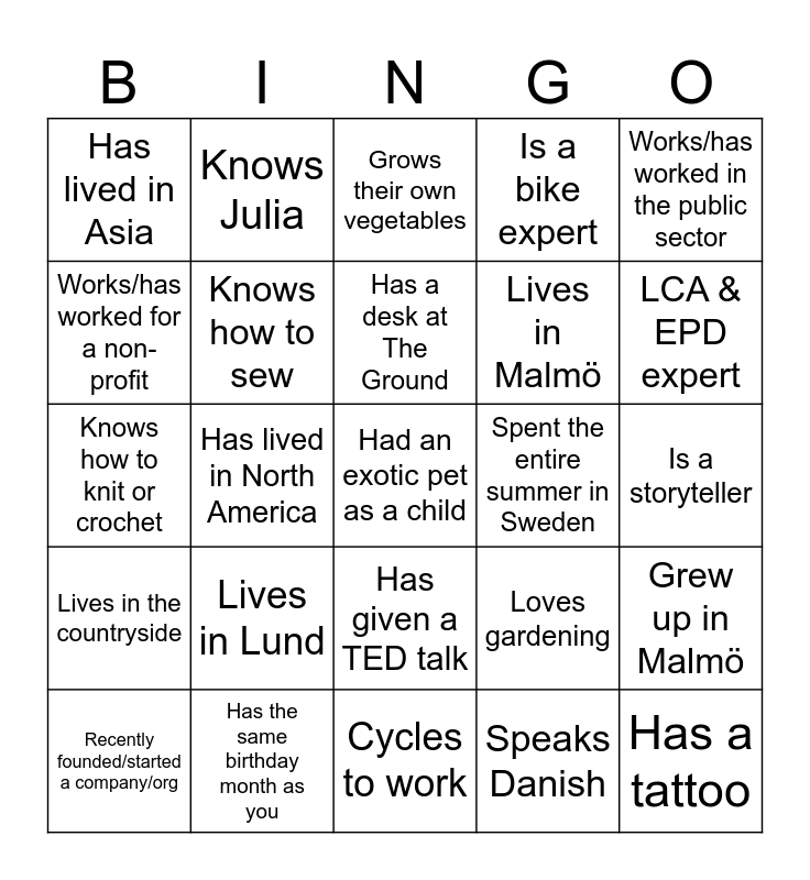 This bingo card has 63 words: Free!, Has hiked the Camino de Santiago, Was a semi-pro ice skater, Grew up in Malmö, Can see their office from their apartment window, Knows Rowan, Knows Julia, Has a kid who has done “studenten”, Has a desk at The Ground, Has worked for the Swedish government, Has given a TED talk, Has worked for Malmö Stad, Is a storyteller, Works/has worked in the public sector, IS a communication professional, Works/has worked for a non-profit, Has lived in North America, Has lived in Asia, Has lived in South America, Lives in Malmö, Lives in Lund, Lives in the countryside, Is a bike expert, Studies/has studied at Folkhögskola, Is an educator, Speaks <3 languages, Circular economy expert, Is a published author, In an agroecologist, Plays an instrument, Considers themselves a climate activist, Has a design background, Works/has worked in academia, interested in permaculture, agroforestry and/or regenerative agriculture, LCA & EPD expert, Recently founded/started a company/org, Sustainable & circular transitions professional, Speaks Danish, Never regrets a dip in the ocean!, Knows how to sew, Knows how to knit or crochet, Spent the entire summer in Sweden, Owned a package-free shop, Knows a thing or two about beans, Had an exotic pet as a child, Has the same birthday month as you, Has a tattoo, Loves gardening, Went to Malmöfestivalen, Has nothing from IKEA in their home, Works remotely, Cycles to work, Loves gaming, Has lived in London, Knows how to knit, Grows their own vegetables, Is the first on the dance floor, Knows what “scope 3 emissions” are, Can explain what ESG stands for, 29. Studied a sustainability program, Can describe what greenwashing is, Takes the plastic lids of cartons when recycling and Has taken the train to another country (Denmark doesn’t count).