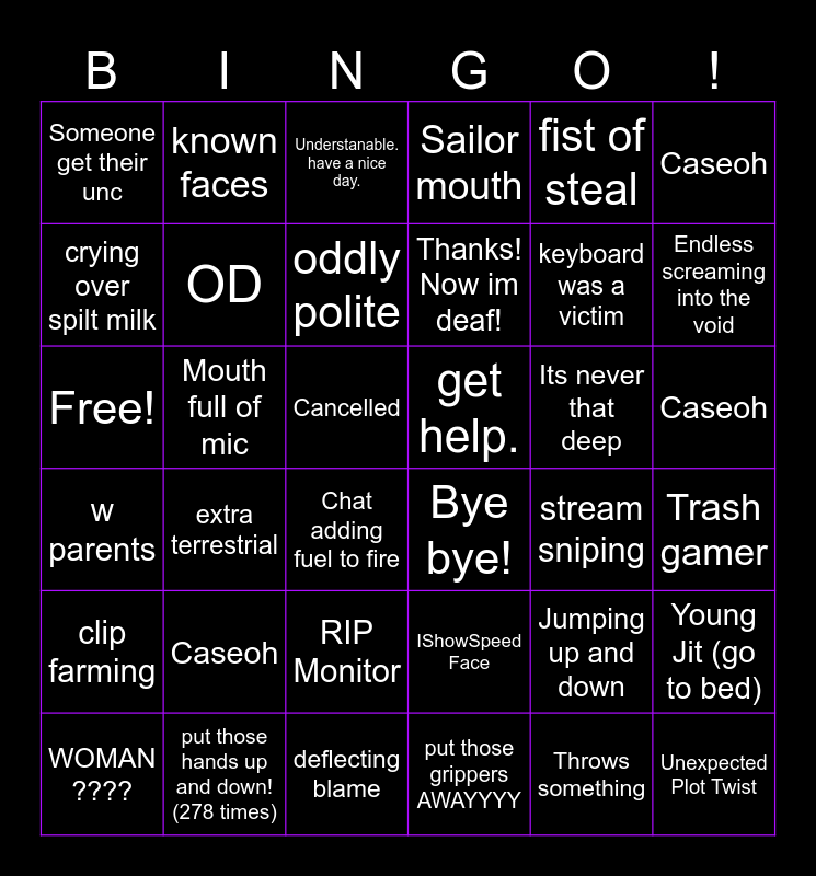 This bingo card has 36 words: IShowSpeed Face, RIP Monitor, put those grippers AWAYYYY, crying over spilt milk, w parents, get help., OD, deflecting blame, fist of steal, Jumping up and down, Endless screaming into the void, Sailor mouth, Young Jit (go to bed), Mouth full of mic, Thanks! Now im deaf!, Someone get their unc, clip farming, Its never that deep, Free!, Understanable. have a nice day., Cancelled, extra terrestrial, Bye bye!, Chat adding fuel to fire, stream sniping, known faces, keyboard was a victim, put those hands up and down! (278 times), oddly polite, Caseoh, Unexpected Plot Twist, WOMAN ????, Trash gamer, Caseoh, Caseoh and Throws something.