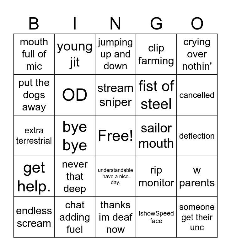 This bingo card has a free space and 24 words: never that deep, chat adding fuel, stream sniper, endless scream, crying over nothin', mouth full of mic, put the dogs away, young jit, sailor mouth, understandable have a nice day., fist of steel, extra terrestrial, rip monitor, w parents, OD, IshowSpeed face, deflection, jumping up and down, cancelled, bye bye, someone get their unc, get help., clip farming and thanks im deaf now.
