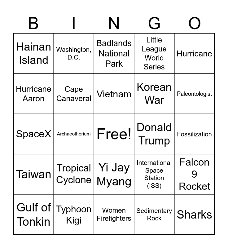 This bingo card has a free space and 24 words: Tropical Cyclone, Typhoon Kigi, Vietnam, Gulf of Tonkin, Hurricane, Hainan Island, Hurricane Aaron, Washington, D.C., Donald Trump, Yi Jay Myang, Korean War, SpaceX, International Space Station (ISS), Falcon 9 Rocket, Cape Canaveral, Sedimentary Rock, Fossilization, Badlands National Park, Paleontologist, Archaeotherium, Sharks, Taiwan, Little League World Series and Women Firefighters.