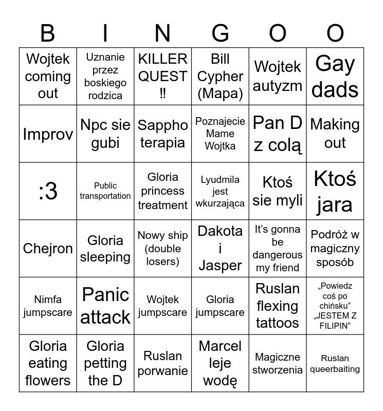 This bingo card has 36 words: Gloria jumpscare, Wojtek jumpscare, Marcel leje wodę, Improv, Chejron, Lyudmila jest wkurzająca, Npc sie gubi, Ruslan porwanie, Wojtek autyzm, Ruslan flexing tattoos, Making out, Bill Cypher (Mapa), „Powiedz coś po chińsku” „JESTEM Z FILIPIN”, Public transportation, Poznajecie Mame Wojtka, Wojtek coming out, Nimfa jumpscare, Ktoś sie myli, :3, KILLER QUEST ‼️, Gloria princess treatment, Gloria sleeping, Dakota i Jasper, Nowy ship (double losers), It’s gonna be dangerous my friend, Uznanie przez boskiego rodzica, Pan D z colą, Gloria petting the D, Sappho terapia, Gay dads, Ruslan queerbaiting, Gloria eating flowers, Podróż w magiczny sposób, Ktoś jara, Panic attack and Magiczne stworzenia.