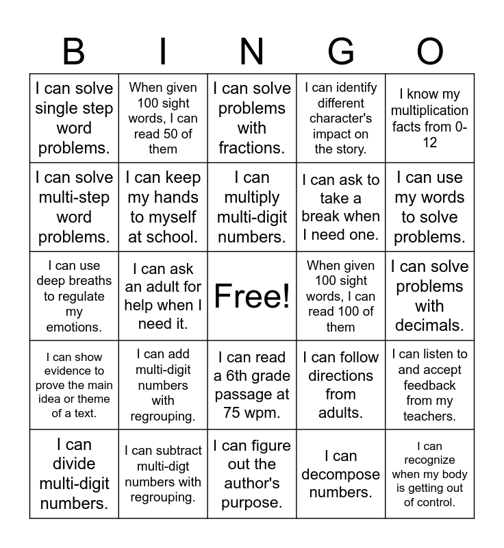 This bingo card has a free space and 24 words: I can add multi-digit numbers with regrouping., I can subtract multi-digt numbers with regrouping., I can multiply multi-digit numbers., I can divide multi-digit numbers., I know my multiplication facts from 0-12, I can solve single step word problems., I can solve multi-step word problems., When given 100 sight words, I can read 50 of them, When given 100 sight words, I can read 100 of them, I can read a 6th grade passage at 75 wpm., I can ask to take a break when I need one., I can use deep breaths to regulate my emotions., I can follow directions from adults., I can listen to and accept feedback from my teachers., I can keep my hands to myself at school., I can decompose numbers., I can solve problems with decimals., I can solve problems with fractions., I can use my words to solve problems., I can ask an adult for help when I need it., I can recognize when my body is getting out of control., I can show evidence to prove the main idea or theme of a text., I can identify different character's impact on the story. and I can figure out the author's purpose..