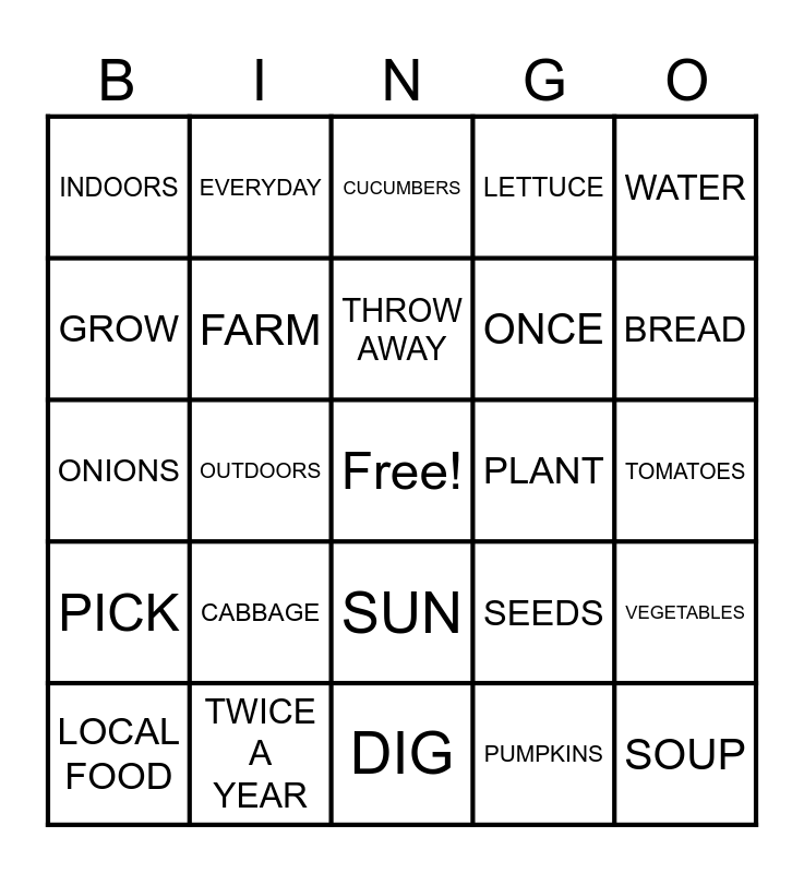 This bingo card has a free space and 24 words: CABBAGE, TWICE A YEAR, THROW AWAY, LOCAL FOOD, WATER, INDOORS, GROW, EVERYDAY, PLANT, SUN, ONCE, ONIONS, SEEDS, VEGETABLES, FARM, PUMPKINS, TOMATOES, CUCUMBERS, BREAD, OUTDOORS, SOUP, PICK, LETTUCE and DIG.