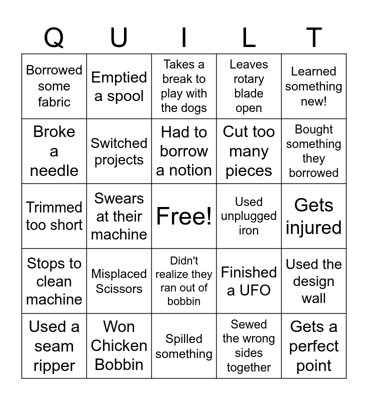 This bingo card has a free space and 24 words: Misplaced Scissors, Won Chicken Bobbin, Had to borrow a notion, Used a seam ripper, Learned something new!, Borrowed some fabric, Broke a needle, Emptied a spool, Used unplugged iron, Didn't realize they ran out of bobbin, Cut too many pieces, Trimmed too short, Finished a UFO, Used the design wall, Switched projects, Sewed the wrong sides together, Gets injured, Takes a break to play with the dogs, Bought something they borrowed, Swears at their machine, Gets a perfect point, Stops to clean machine, Leaves rotary blade open and Spilled something.