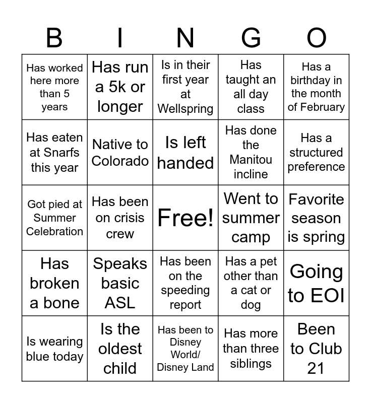 This bingo card has a free space and 24 words: Speaks basic ASL, Is the oldest child, Is left handed, Is wearing blue today, Has a birthday in the month of February, Has worked here more than 5 years, Has eaten at Snarfs this year, Has run a 5k or longer, Went to summer camp, Has been on the speeding report, Has done the Manitou incline, Got pied at Summer Celebration, Has a pet other than a cat or dog, Going to EOI, Native to Colorado, Has more than three siblings, Favorite season is spring, Is in their first year at Wellspring, Has a structured preference, Has been on crisis crew, Been to Club 21, Has broken a bone, Has taught an all day class and Has been to Disney World/ Disney Land.