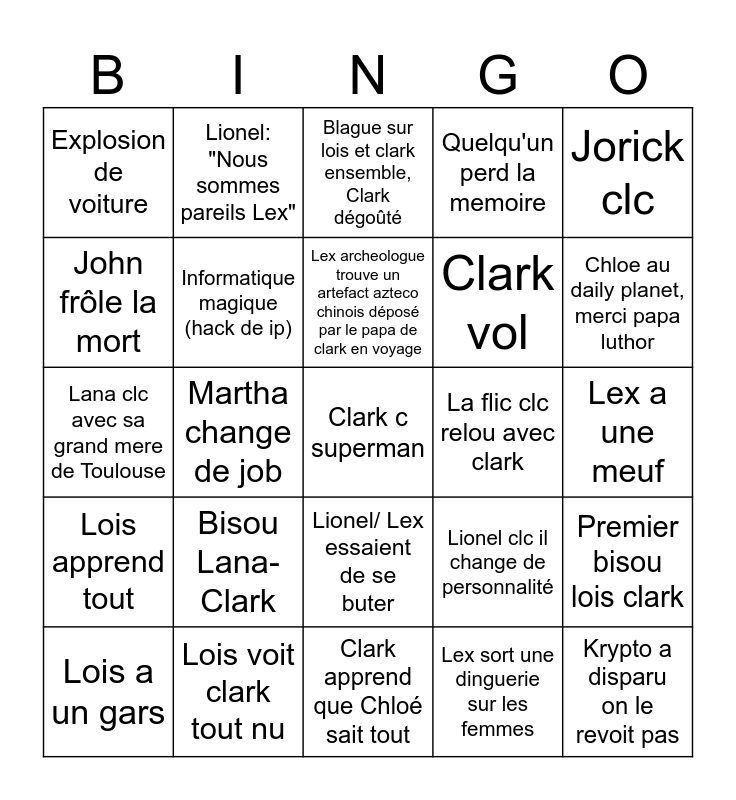 This bingo card has a free space and 24 words: Bisou Lana-Clark, Lois voit clark tout nu, Lex archeologue trouve un artefact azteco chinois déposé par le papa de clark en voyage, Lois a un gars, Jorick clc, Explosion de voiture, John frôle la mort, Lionel: "Nous sommes pareils Lex", La flic clc relou avec clark, Lionel/ Lex essaient de se buter, Clark vol, Lana clc avec sa grand mere de Toulouse, Lionel clc il change de personnalité, Premier bisou lois clark, Informatique magique (hack de ip), Lex sort une dinguerie sur les femmes, Lex a une meuf, Blague sur lois et clark ensemble, Clark dégoûté, Chloe au daily planet, merci papa luthor, Martha change de job, Krypto a disparu on le revoit pas, Lois apprend tout, Quelqu'un perd la memoire and Clark apprend que Chloé sait tout.