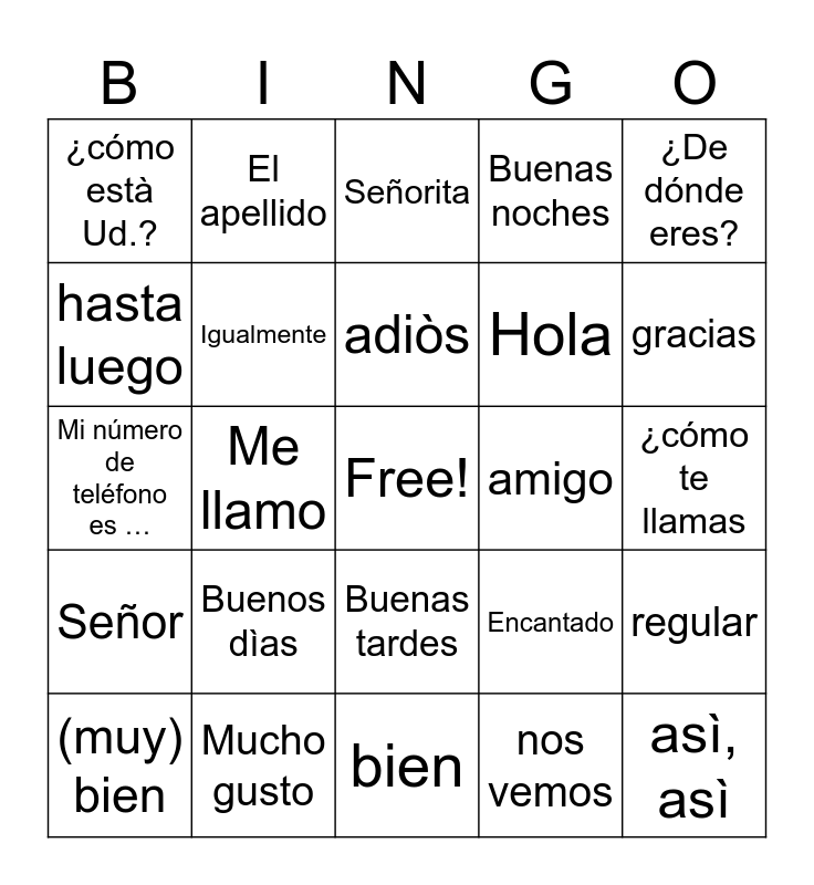 This bingo card has a free space and 24 words: Buenos dìas, Mucho gusto, adiòs, (muy) bien, ¿De dónde eres?, ¿cómo està Ud.?, hasta luego, El apellido, amigo, Buenas tardes, Hola, Mi número de teléfono es …, Encantado, regular, Igualmente, nos vemos, ¿cómo te llamas, Señorita, gracias, Me llamo, asì, asì, Señor, Buenas noches and bien.