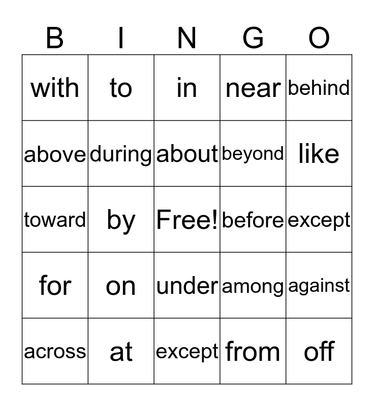 This bingo card has a free space and 24 words: on, at, about, across, behind, with, above, to, before, under, beyond, toward, among, against, during, from, except, in, like, by, off, for, near and except.