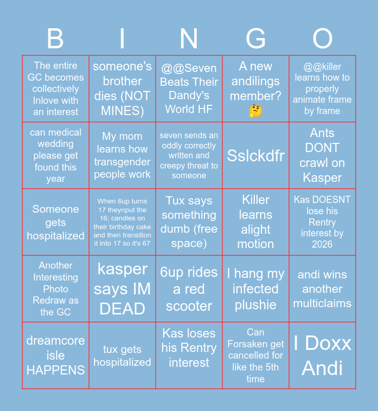 This bingo card has a free space and 24 words: kasper says IM DEAD, tux gets hospitalized, seven sends an oddly correctly written and creepy threat to someone, dreamcore isle HAPPENS, @@killer learns how to properly animate frame by frame, The entire GC becomes collectively Inlove with an interest, can medical wedding please get found this year, someone's brother dies (NOT MINES), Killer learns alight motion, 6up rides a red scooter, Sslckdfr, Someone gets hospitalized, I hang my infected plushie, andi wins another multiclaims, My mom learns how transgender people work, Can Forsaken get cancelled for like the 5th time, Kas DOESNT lose his Rentry interest by 2026, @@Seven Beats Their Dandy's World HF, Ants DONT crawl on Kasper, When 6up turns 17 theynput the 16; candles on their birthday cake and then transition it into 17 so it's 67, I Doxx Andi, Another Interesting Photo Redraw as the GC, A new andilings member?🤔 and Kas loses his Rentry interest.