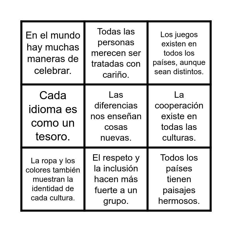 This bingo card has 30 words: Todas las culturas tienen comidas deliciosas y diferentes., Todos los idiomas son valiosos y sirven para comunicarnos., Bailar es una forma de compartir la alegría en cualquier cultura., Todos los pueblos tienen historias y leyendas que enseñan., En el mundo hay muchas maneras de celebrar., Los juegos existen en todos los países, aunque sean distintos., La ropa y los colores también muestran la identidad de cada cultura., Cada familia tiene tradiciones que la hacen especial., En todas partes hay canciones que unen a las personas., Todos los niños y niñas tienen derecho a aprender y jugar., La amistad no tiene fronteras., Todas las culturas tienen algo único que ofrecer., En todas partes del mundo hay personas que sonríen y ríen., Todos somos diferentes y eso es valioso., La diversidad hace que el mundo sea más bonito., Todos los pueblos tienen fiestas importantes., Compartir es importante en todas las culturas., El respeto une a las personas aunque piensen distinto., La música viaja sin fronteras., Las diferencias nos enseñan cosas nuevas., La igualdad significa que todos tenemos los mismos derechos., En el mundo hay muchas formas de saludar., Todas las personas merecen ser tratadas con cariño., Todos los países tienen paisajes hermosos., La cooperación existe en todas las culturas., Cada idioma es como un tesoro., Las similitudes nos acercan, las diferencias nos enriquecen., Todas las culturas tienen juegos y juguetes divertidos., El respeto y la inclusión hacen más fuerte a un grupo. and Todas las personas somos importantes, sin importar de dónde venimos..