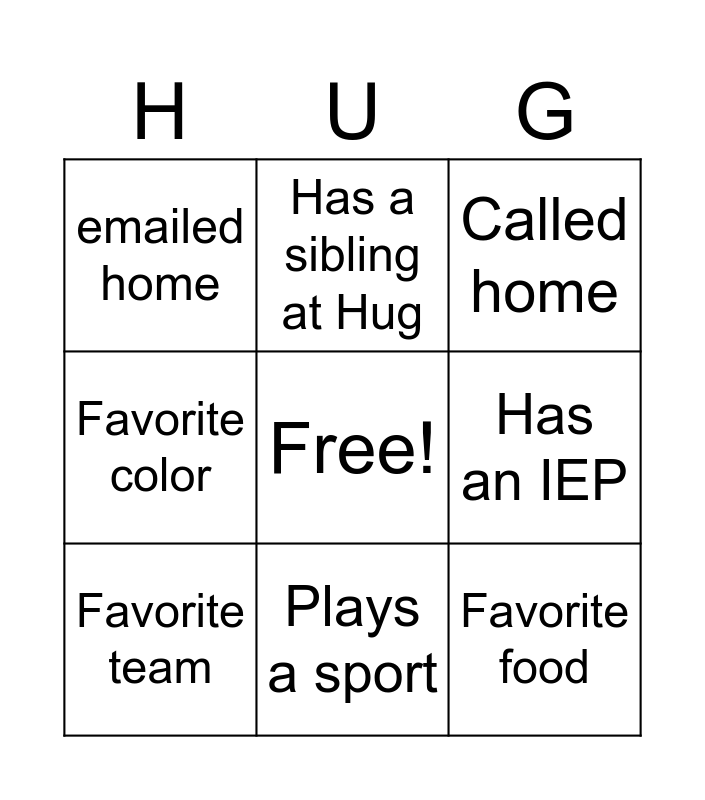 This bingo card has a free space and 8 words: Favorite color, Has a sibling at Hug, Has an IEP, Favorite team, Called home, emailed home, Plays a sport and Favorite food.