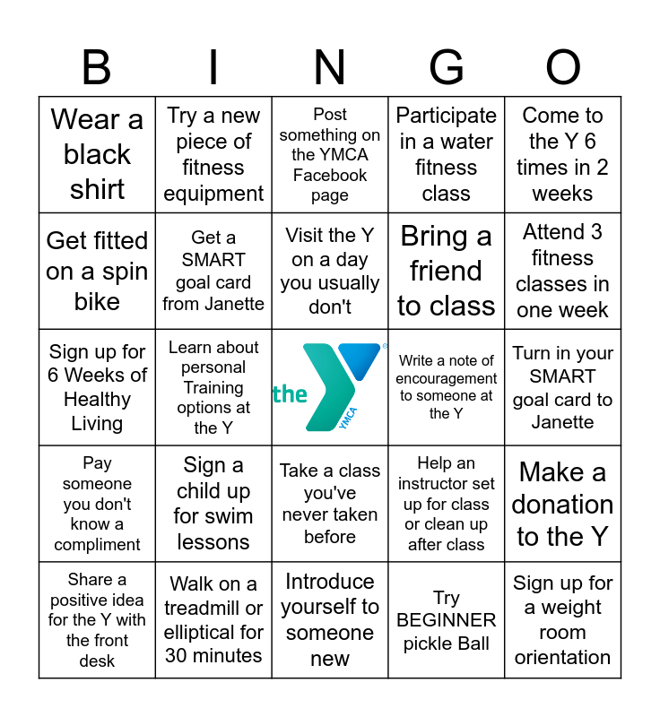 This bingo card has a free space and 24 words: Sign a child up for swim lessons, Walk on a treadmill or elliptical for 30 minutes, Visit the Y on a day you usually don't, Share a positive idea for the Y with the front desk, Come to the Y 6 times in 2 weeks, Wear a black shirt, Get fitted on a spin bike, Try a new piece of fitness equipment, Write a note of encouragement to someone at the Y, Take a class you've never taken before, Bring a friend to class, Sign up for 6 Weeks of Healthy Living, Help an instructor set up for class or clean up after class, Make a donation to the Y, Get a SMART goal card from Janette, Try BEGINNER pickle Ball, Turn in your SMART goal card to Janette, Post something on the YMCA Facebook page, Attend 3 fitness classes in one week, Learn about personal Training options at the Y, Sign up for a weight room orientation, Pay someone you don't know a compliment, Participate in a water fitness class and Introduce yourself to someone new.