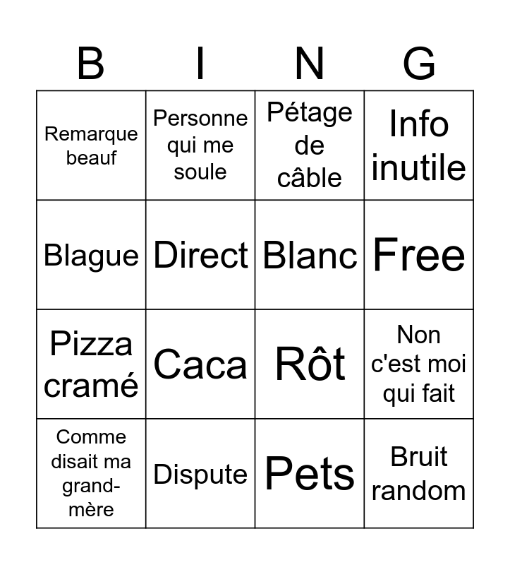 This bingo card has 16 words: Dispute, Non c'est moi qui fait, Pétage de câble, Remarque beauf, Pizza cramé, Personne qui me soule, Rôt, Pets, Blague, Direct, Comme disait ma grand-mère, Info inutile, Caca, Free, Blanc and Bruit random.