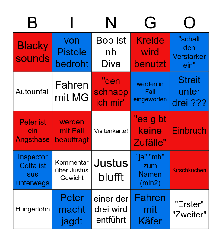 This bingo card has a free space and 24 words: Kommentar über Justus Gewicht, Peter macht jagdt, "den schnapp ich mir", Hungerlohn, "schalt den Verstärker ein", Blacky sounds, Autounfall, von Pistole bedroht, "es gibt keine Zufälle", Justus blufft, werden in Fall eingeworfen, Peter ist ein Angsthase, "ja" "mh" zum Namen (min2), Kirschkuchen, Fahren mit MG, Fahren mit Käfer, Einbruch, Bob ist nh Diva, Streit unter drei ???, werden mit Fall beauftragt, "Erster" "Zweiter", Inspector Cotta ist sus unterwegs, Kreide wird benutzt and einer der drei wird entführt.