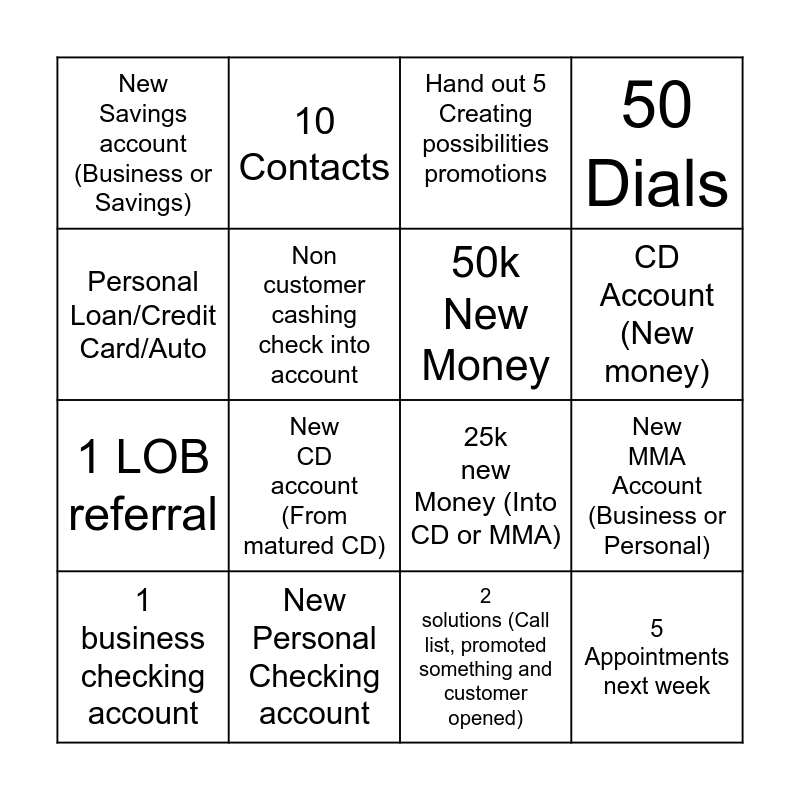 This bingo card has 16 words: New Personal Checking account, New MMA Account (Business or Personal), Hand out 5 Creating possibilities promotions, New Savings account (Business or Savings), 1 LOB referral, 10 Contacts, 25k new Money (Into CD or MMA), 2 solutions (Call list, promoted something and customer opened), Personal Loan/Credit Card/Auto, Non customer cashing check into account, 1 business checking account, 50 Dials, New CD account (From matured CD), CD Account (New money), 50k New Money and 5 Appointments next week.