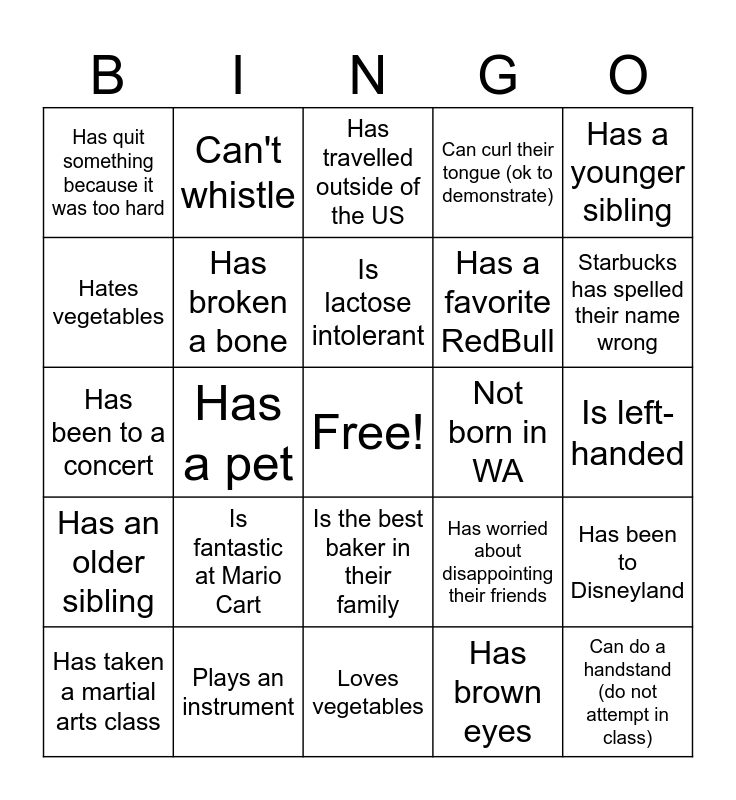 This bingo card has a free space and 39 words: Best stardew valley player, Has had a surgery, Has failed a test, Has broken a bone, Has taken a martial arts class, Is the best baker in their family, Is lactose intolerant, Speaks more than 1 language, Has a younger sibling, Has an older sibling, Has a pet, Can curl their tongue (ok to demonstrate), Can do a handstand (do not attempt in class), Is left-handed, Not born in WA, Is fantastic at Mario Cart, Has gotten a grade they're not proud of, Has quit something because it was too hard, Has worried about disappointing their parents, Has worried about disappointing their friends, Hates vegetables, Loves vegetables, Has a favorite RedBull, Starbucks has spelled their name wrong, Likes to paint, Likes to draw, Plays a sport, Has a widow's peak, Likes dinosaurs more than Ms. Coulthard or Ms. Tran, Can't whistle, Has the same birthday month as you, Has a job, Has travelled outside of the US, Plays an instrument, Has brown eyes, Has a twin, Has been to Disneyland, Has been to a concert and Likes to camp.