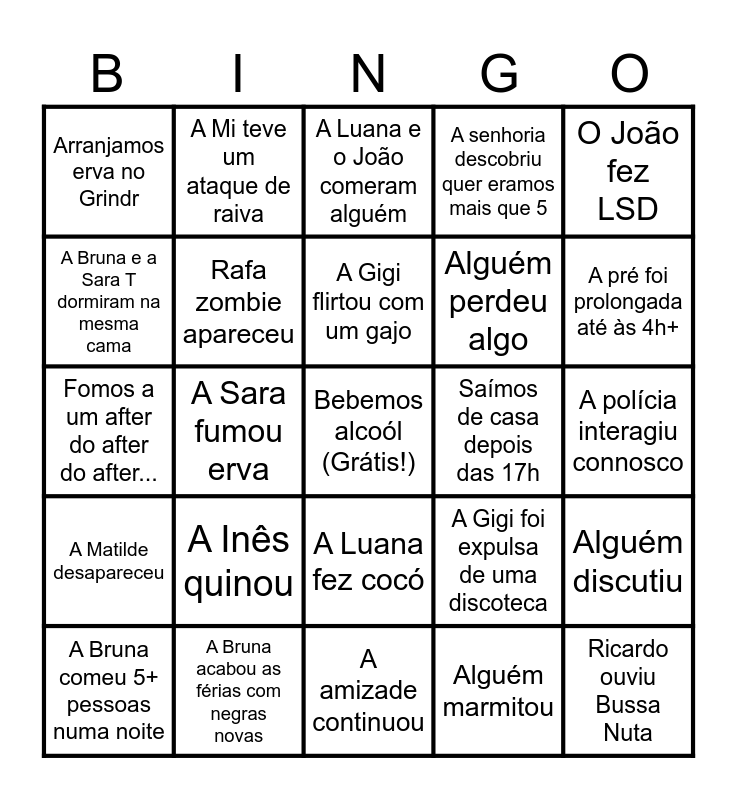 This bingo card has a free space and 24 words: A Inês quinou, A Bruna acabou as férias com negras novas, A Gigi flirtou com um gajo, A Bruna comeu 5+ pessoas numa noite, O João fez LSD, Arranjamos erva no Grindr, A Bruna e a Sara T dormiram na mesma cama, A Mi teve um ataque de raiva, Saímos de casa depois das 17h, A Luana fez cocó, Alguém perdeu algo, Fomos a um after do after do after..., A Gigi foi expulsa de uma discoteca, Alguém discutiu, Rafa zombie apareceu, Alguém marmitou, A polícia interagiu connosco, A Luana e o João comeram alguém, A pré foi prolongada até às 4h+, A Sara fumou erva, Ricardo ouviu Bussa Nuta, A Matilde desapareceu, A senhoria descobriu quer eramos mais que 5 and A amizade continuou.